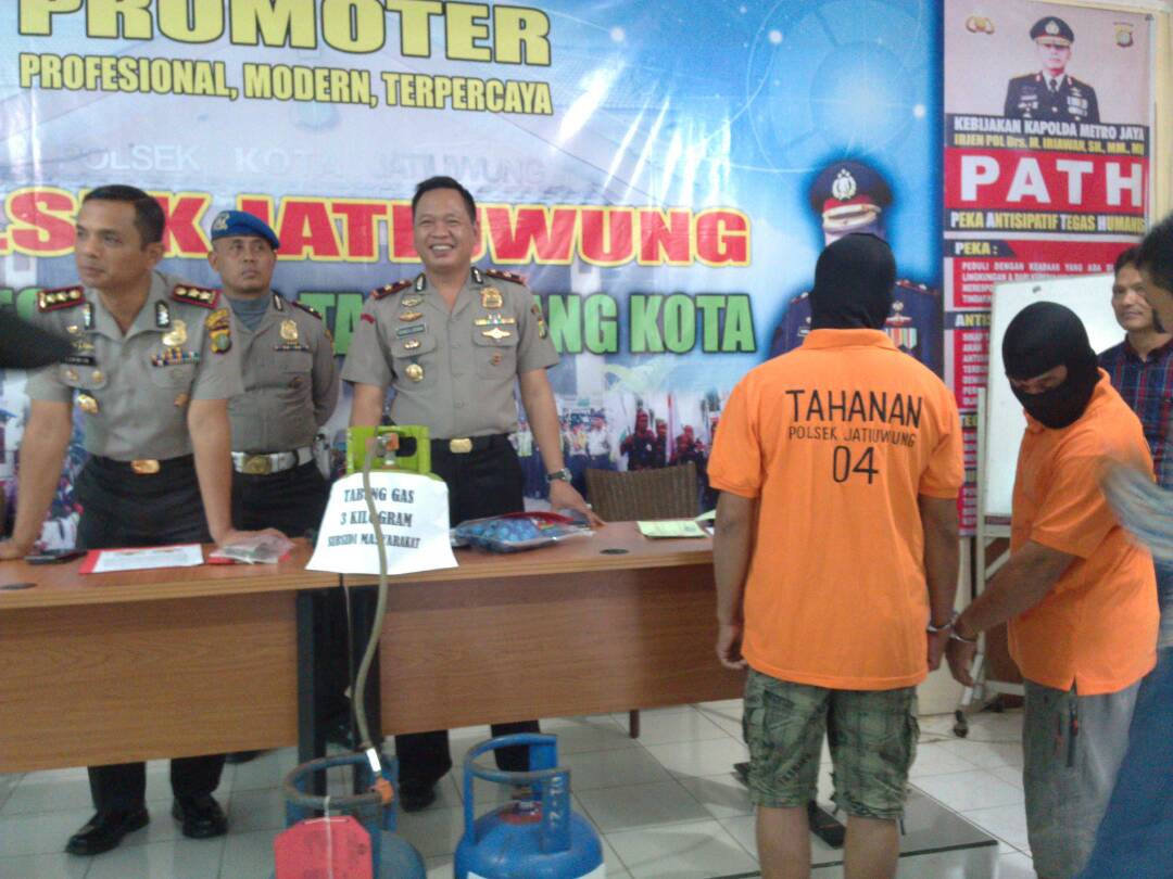 “Jadi tabung gas 3 kg dilepas segelnya, kemudian tabung kosong 12 kg diletakkan diatas sebuah balok sehingga posisinya miring, lalu dipasang selang regulator di kedua tabung. Setelah kedua selang regulator terhubung dan terkunci, pelaku menempelkan es batu di luar tabung 12 kg agar gasnya masuk dari tabung 3 Kg,” jelas Wakpolres Metro Tangerang Kota, AKBP Erwin Kurniawan, Jumat (13/5).