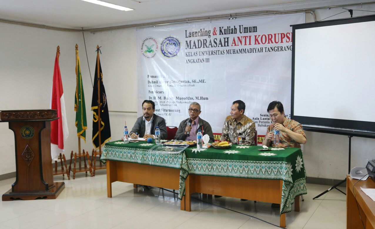 Kegiatan tersebut berlangsung di Aula Lantai 8 UMT dihadiri oleh 250 peserta yang terdiri dari mahasiswa, dan Organisasi Otonom Muhammadiyah, dan unsur Pemerintahan Kota (Pemkot) Tangerang. Adapun narasumbernya adalah Saut Situmorang (KPK RI), Busyro Muqoddas (Ketua PP Muhammadiyah), Ade Irawan (ICW).