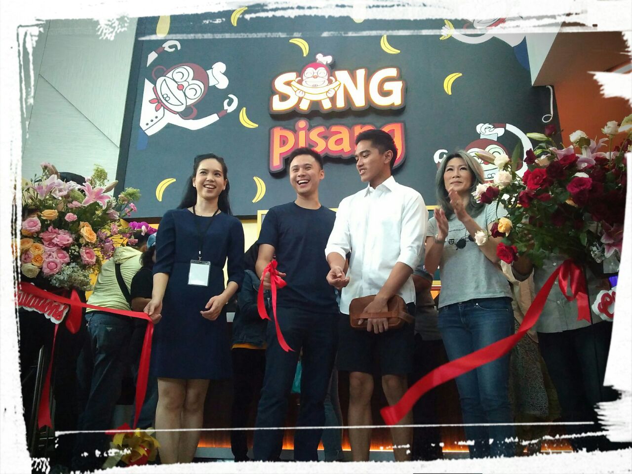 Grand Opening Sang Pisang Supermal Karawaci ditandai dengan pemotongan pita di lokasi gerai tepatnya di Makan Sutra Foodcourt. Hadir Mrs. Pipih Tjandra, Marketing & Leasing General Manager PT Supermal Karawaci, owner Sang Pisang Kaesang Pangarep.