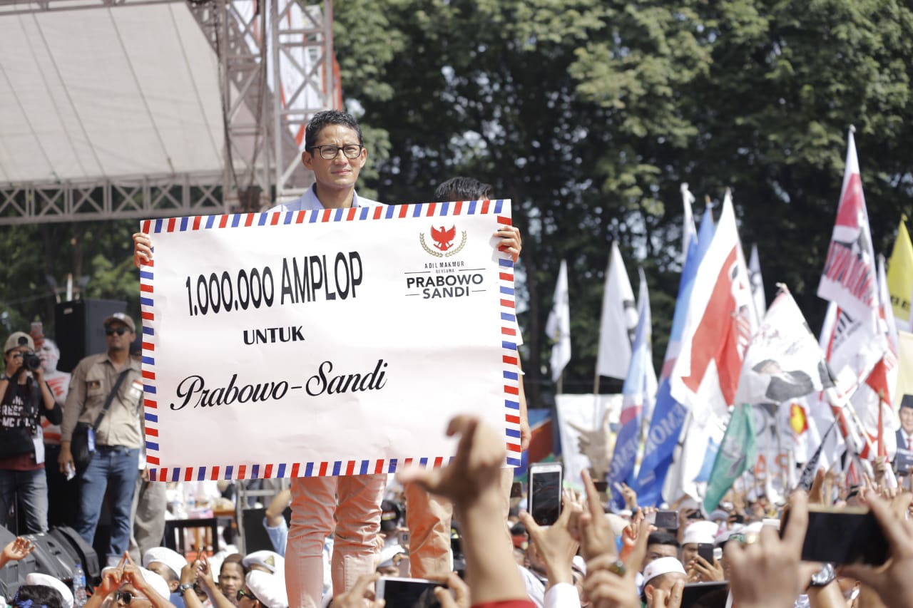 Palapanews.com– Calon Wakil Presiden Nomor Urut 02, Sandiaga Salahudin Uno mendapat bantuan dana dari pendukung, simpatisan, dan masyarakat Tangerang saat menggelar Kampanye Akbar di Alun-alun Kota Tangerang, Sabtu, 13 April 2019.