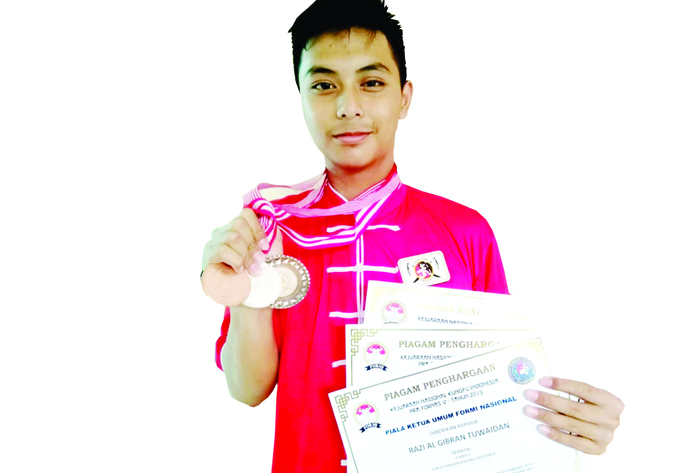 Club Gelora Wushu Indonesia menjadi wadah yang menggembleng Razi, yang tahun ini sudah resmi masuk di jajaran atlet Wushu Tangsel. Karakter Razi saat berlaga dalam pertandingan dikenal tegas juga cepat seperti macan menerjang. (bd)