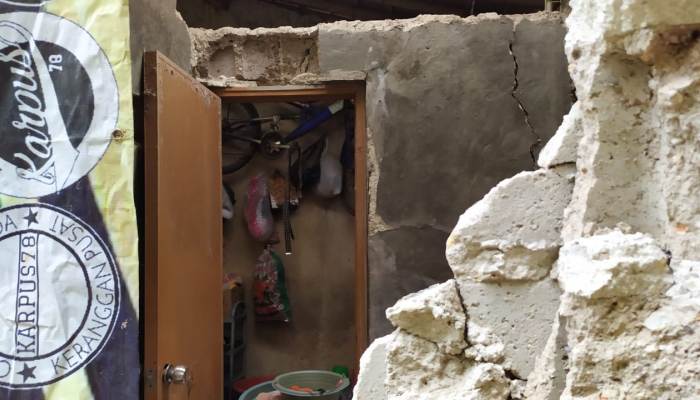 “Dideretan ini ada 6 rumah yang retak terus satu rumah ada dibelakang. Yang paling parah rumah saya, temboknya ambruk siang-siang. Saya kaget, bunyi ambruk kenceng banget tiba-tiba ‘brek’ aja,” kata istri Ketua RT 014.