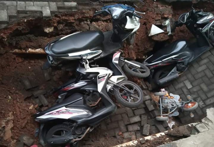 “Alhamdulillah tidak ada korban saat tanah amblas. Cuma 4 motor yang depannya amblas aja ini ikut tercebur,” ucapnya.