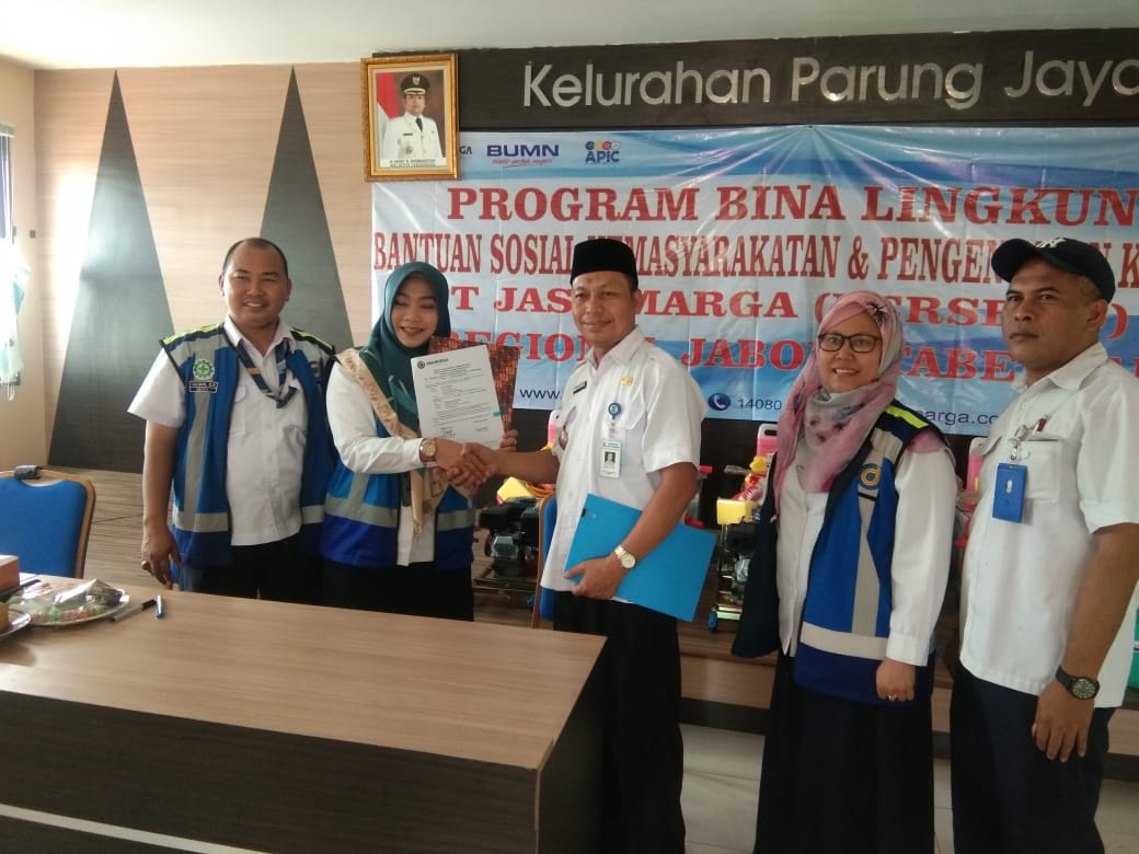 Bantuan yang diserahkan langsung di Aula Kantor Kelurahan Parung Jaya ini merupakan salah satu program bina lingkungan bantuan sosial kemasyarakatan dan pengentasan kemiskinan yang diberikan langsung oleh Ira Susiyanti sebagai Dephead Markom PT Jasa Marga dan diterima oleh Lurah Parung Jaya, Murdani. S.Ag, MM.