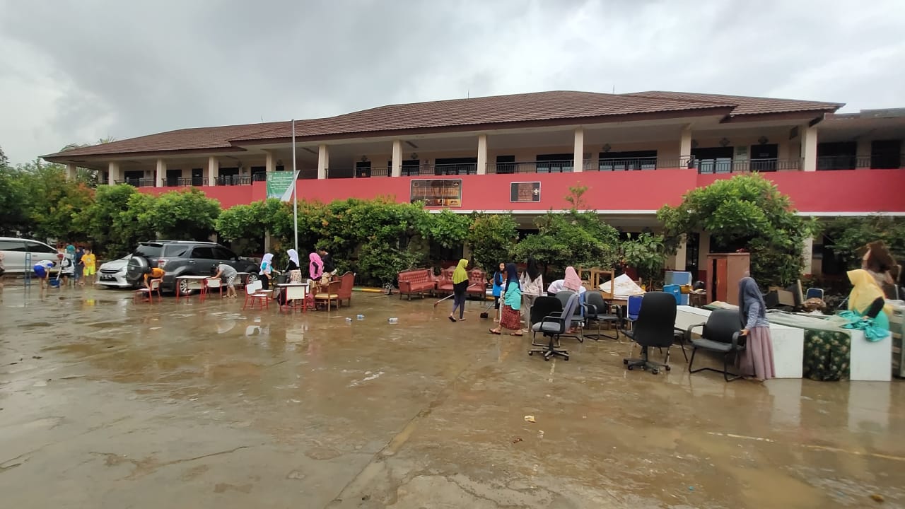 “Banyak yang rusak seperti pintu yang telah jebol, bangku dan meja belajar yang patah, ditambah buku pinjaman BOS rusak. Hal itu karena banjir yang merendam sekolah cukup parah dengan tinggi sekitar 2,5 meter, belum lagi arus airnya cukup deras,” ungkapnya.