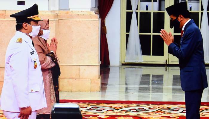 Palapanews.com- Presiden Joko Widodo (Jokowi) melantik Ahmad Riza Patria sebagai Wakil Gubernur (Wagub) Provinsi DKI Jakarta untuk sisa masa jabatan 2017-2022 di Istana Negara, Provinsi DKI Jakarta, Rabu (15/4/2020).