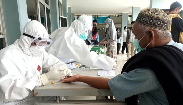 Palapanews.com- Jamaah Masjid Al Mujahidin Serpong, Tangerang Selatan (Tangsel) menjalani rapid test lantaran menggelar salat Jumat di tengah pandemi Virus Corona (Covid-19), Jumat (1/5/2020).