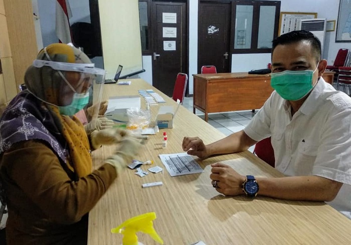 Palapanews.com – Para Komisioner dan pegawai Komisi Pemilihan Umum (KPU) Kabupaten Serang menjalani rapid test (RT) di Sekretariat KPU setempat Jalan Kitapa Cilame Kota Serang pada Selasa, 30 Juni 2020. RT dilakukan oleh petugas Dinas Kesehatan (Dinkes) atau Tim Gugus Percepatan Penanganan Covid-19 Kabupaten Serang.