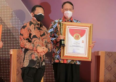 Piagam serta trophy diserahkan Menteri Dalam Negeri Republik Indonesia M. Tito Karnavian kepada Gubernur Banten, Wahidin Halim dengan memperhatikan dan melaksanakan protokol kesehatan, Jum’at, 18 Desember 2020.