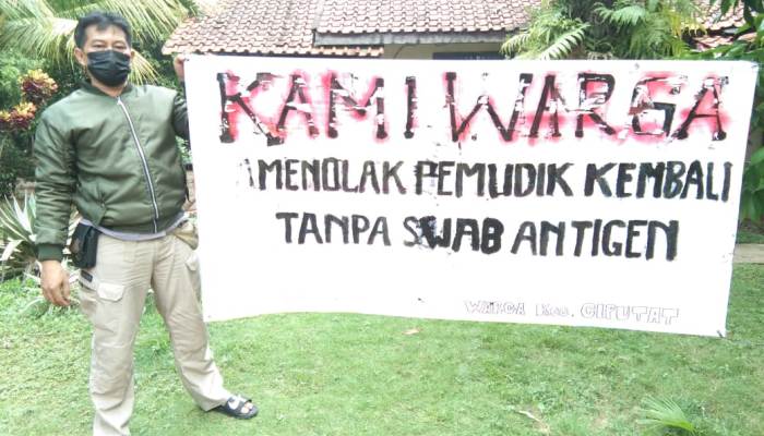 Tak hanya di Pamulang, warga Ciputat juga membentangkan spanduk dengan tulisan “Kami warga menolak pemudik kembali tanpa swab antigen,” tulisnya.
