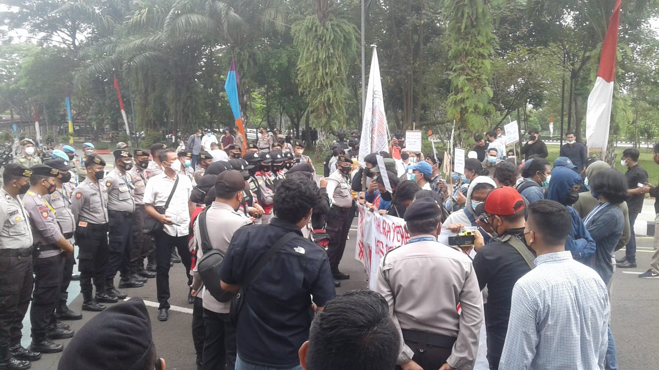 Palapanews.com- Peringatan HUT ke-389 Kabupaten Tangerang diwarnai aksi unjuk rasa mahasiswa yang berakhir ricuh, Rabu, 13 Oktober 2021.