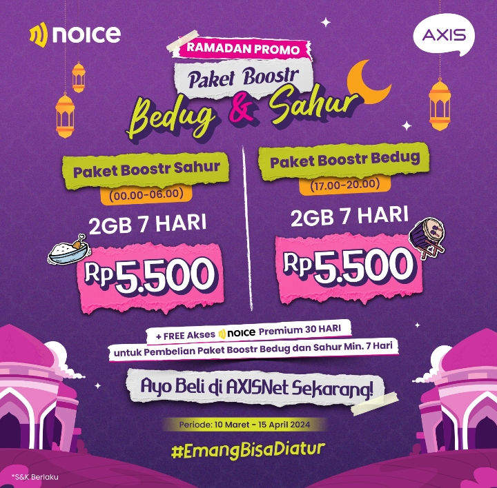 3. Boostr Bedug & Sahur yaitu kuota utama di jam Sahur (00-06) dan jam Bedug (17-20) dan gratis akses Noice Premium 30 hari khusus pembelian 10 Maret – 15 April 2024