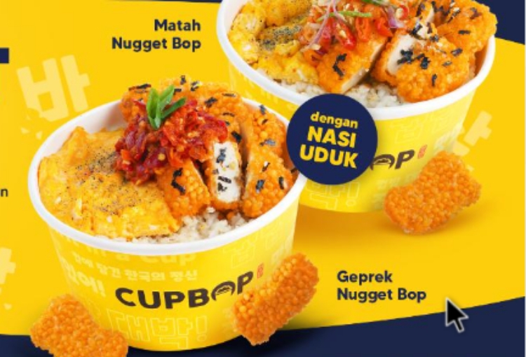 Nugget Bop adalah rice bowl yang menghadirkan kelezatan nasi uduk disajikan lengkap dengan potongan Kanzler Crispy Chicken Nugget, ditambah dengan scramble egg yang lembut, serta sambal geprek atau matah. Menu ini dibanderol mulai dari Rp30.000 per mangkuk dan bisa didapatkan hanya di 13 gerai Cupbop di Jabodetabek, Surabaya, dan Denpasar, serta dapat dipesan melalui aplikasi F&B ID App dan aplikasi layanan pesan antar.