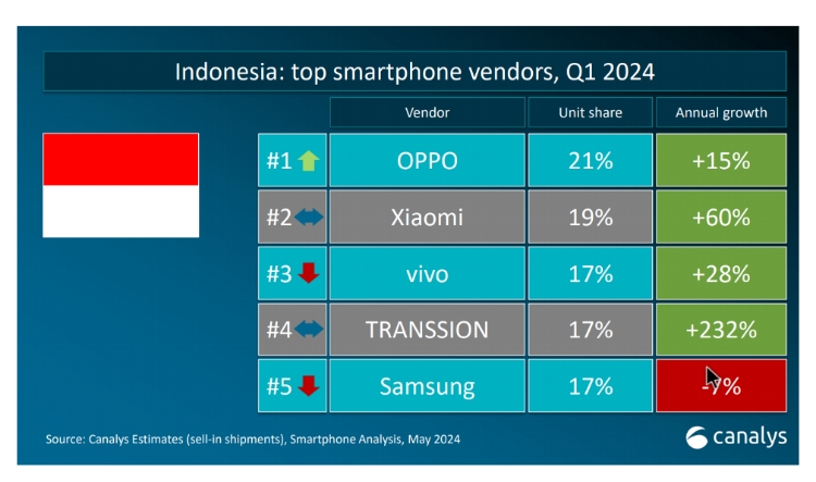 Palapanews.com – Menurut laporan Firma Analis Canalys, OPPO menjadi pemimpin pasar smartphone di Indonesia dengan pangsa pasar 21%. Hal ini, menandakan kenaikan tahunan yang signifikan sebesar 15% untuk OPPO, menunjukkan pertumbuhan dan popularitas merek yang berkelanjutan di antara konsumen Indonesia.