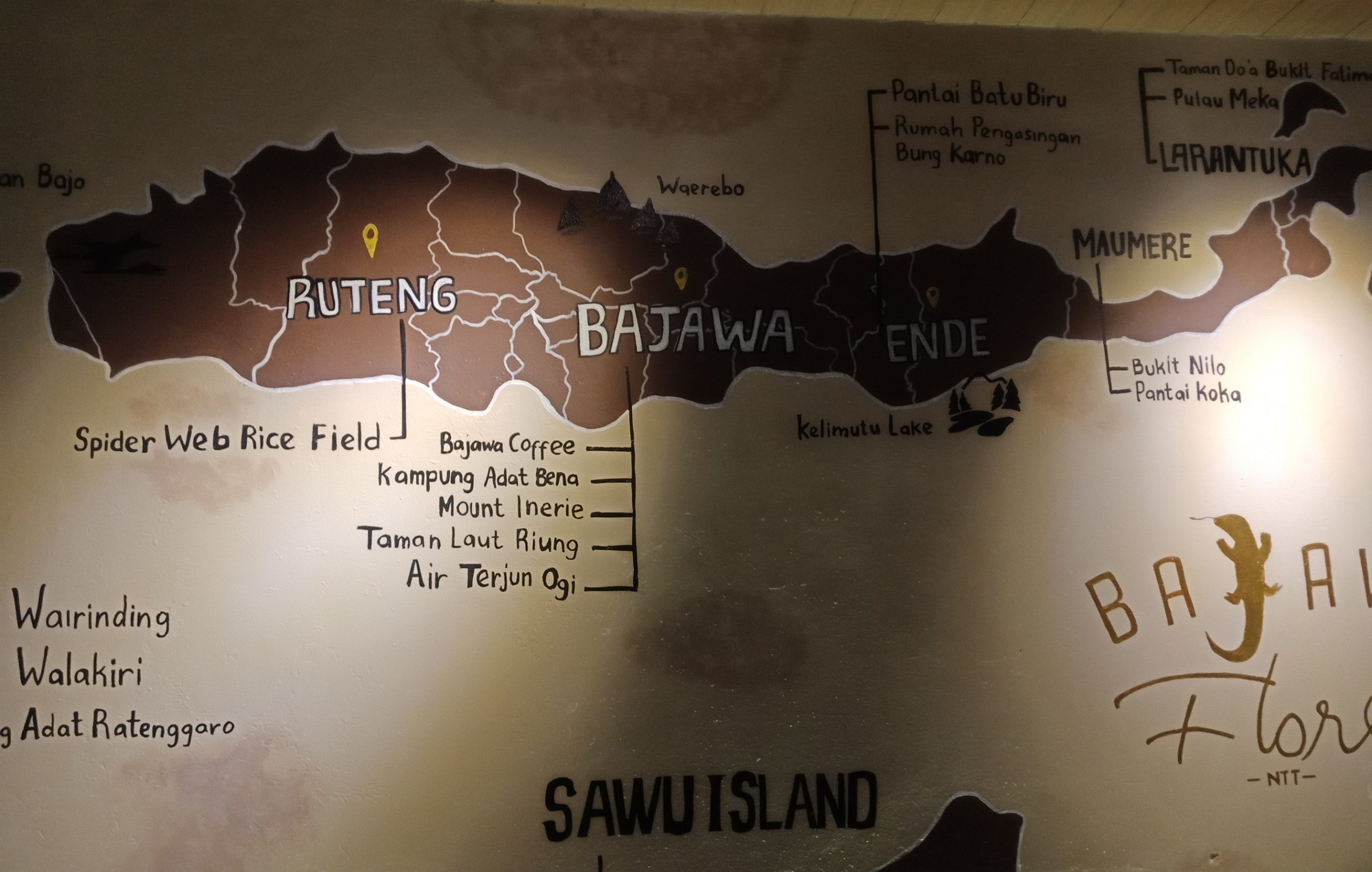 Tampilan besar berupa gambar peta Pulau Flores di tengah ruangan menjadi trademark kafe ini. Ada juga dekorasi berupa kain khas NTT, potret foto penduduk suku Flores, serta motif etnik khas yang terpampang rapi di sudut ruangan.